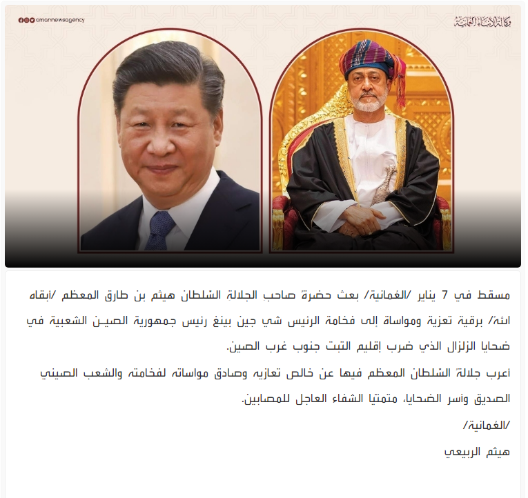 1月7日,阿曼通讯社报道,阿曼苏丹海赛姆就中国西藏地区发生地震向习近平主席致慰问电。