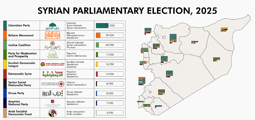 10月5日,叙举行政局剧变后首次立法机构选举,近1600名候选人展开角逐。根据叙政权发布的立法机构临时选举制度,叙立法机构由210席组成,其中70席由叙政权领导人沙拉直接任命,其余140席被分配至全国14省的60个选区。6日,叙立法机构选举最高委员会公布首次立法机构选举结果:选举从叙利亚全国49个选区中选出119个席位。苏韦达省、拉卡省、哈塞克省分配的21个席位暂时空缺。